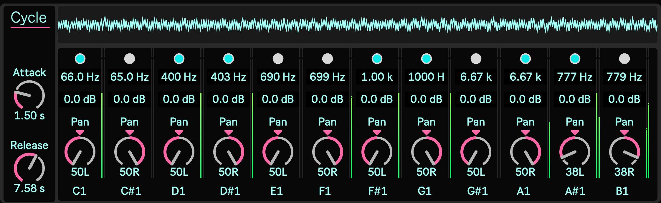 Cycle is composed of twelve oscillators, each with individual control over gain, pan, and frequency. Unlike conventional synthesizers that conform to MIDI tuning, Cycle allows every oscillator to be assigned in hertz, completely decoupled from equal temperament. Incoming notes are analyzed only for their pitch class—from C to B—and mapped to the twelve oscillators. This method transforms harmonic organization into a flexible system for constructing non-tempered structures.