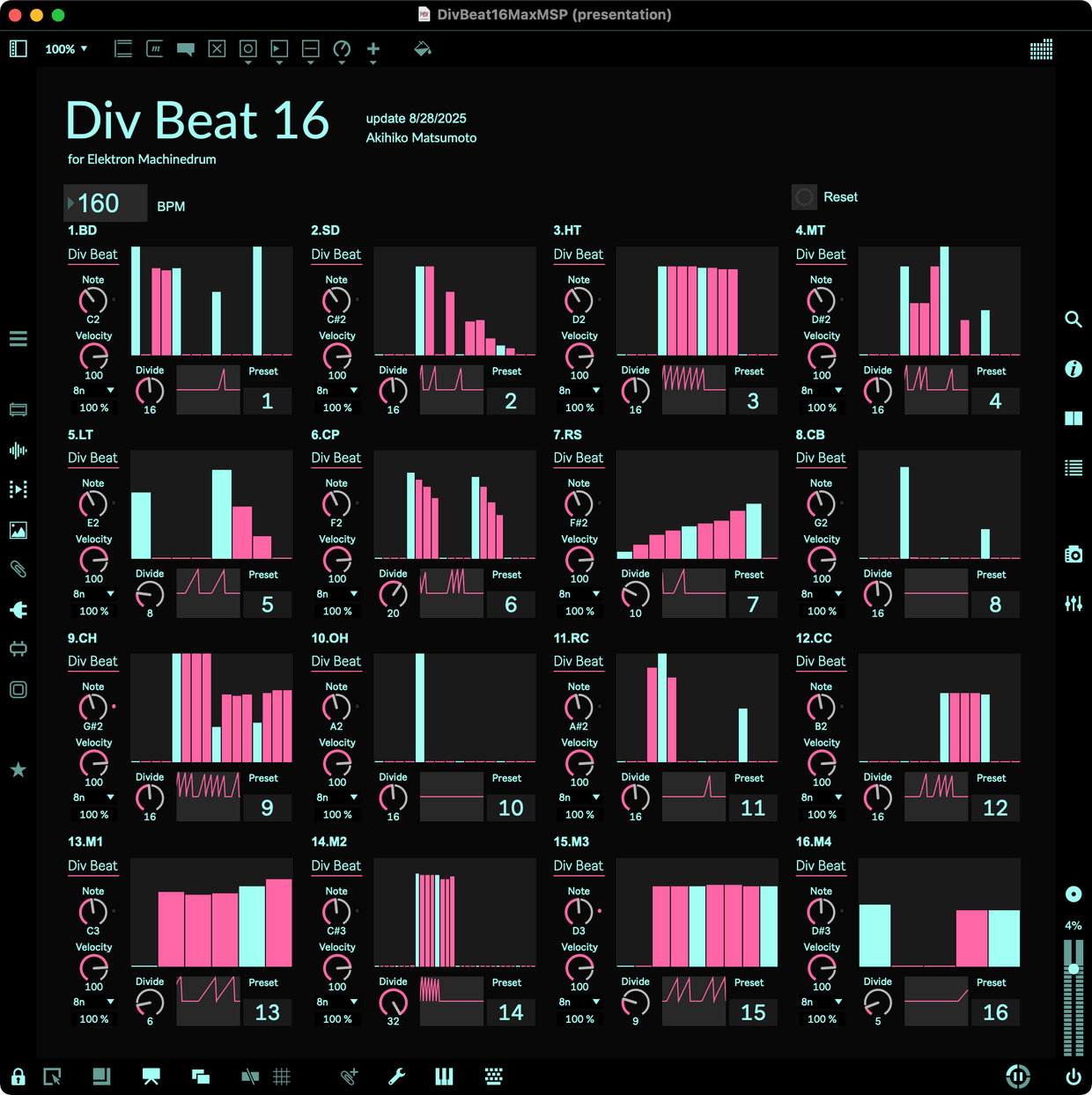 ver.1.2 ... Added bonus DivBeat16 maxpat, Fixed one-beat delay bug & expanded preset slot. (2025/8/28)